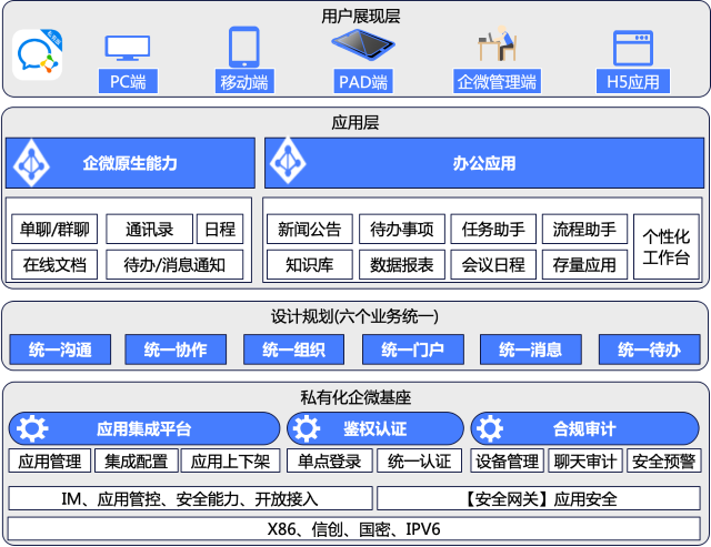 平台构建了完善的权限系统、身份认证和清静战略,确保稳固运行和数据清静。企微基座服务完全基于国产芯片与国产操作系统安排,且是全量私有化安排,可以在完全关闭互联网的护网时代正常使用。